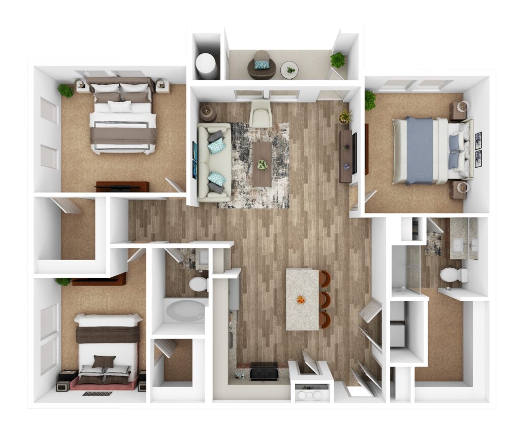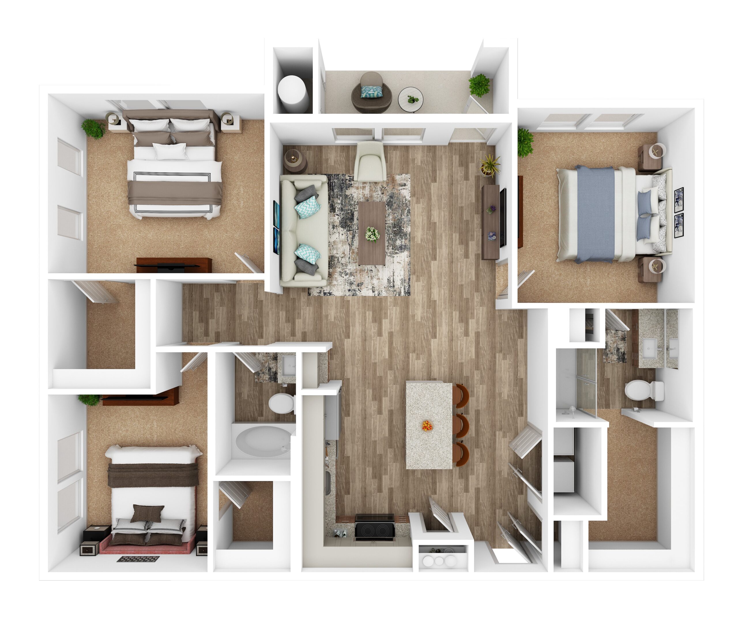 The C1 plan in Ascend Symmetry offers 1,387 square feet of space. This plan features three bedrooms and two baths. Please call 702-444-7754 for leasing information.