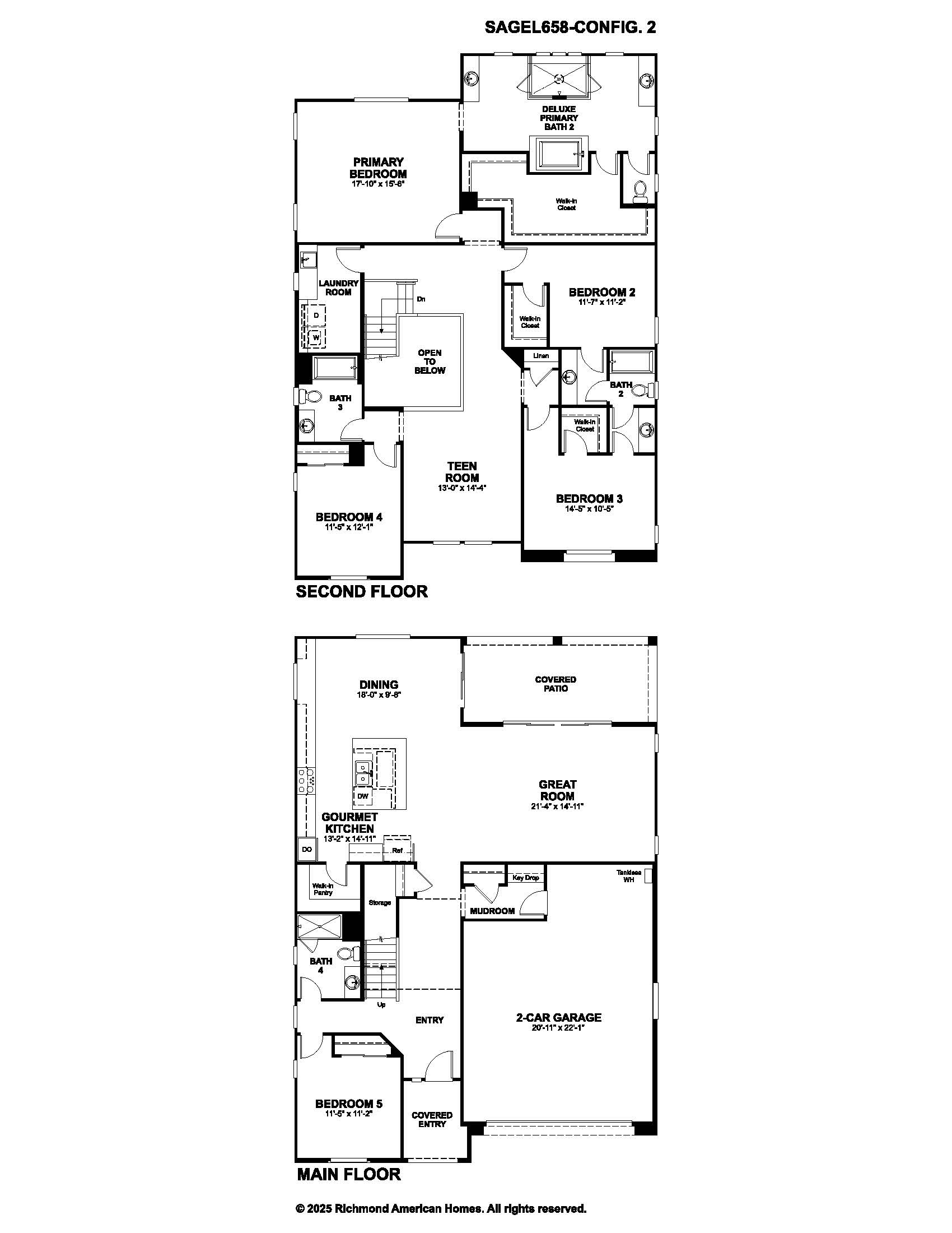 This Sage plan (lot 61) in Interlude by Richmond American Homes features 3,270 square feet of living space. The Sage plan offers comfortable spaces for living, working and entertaining. Gather in the spacious great room or dining area—both open to the gourmet kitchen with large center island and walk-in pantry—or move the party onto the covered patio with center-meet doors. Don’t worry about disturbing anyone in the study/optional guest bedroom; it’s separated from the other main-floor spaces for privacy. Upstairs you’ll find comfortable bedrooms, a primary suite with private bath, a teen room and a convenient laundry.
