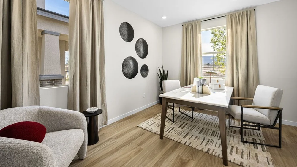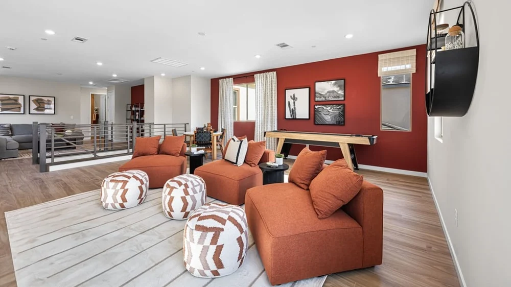The Willow plan in Opus by Taylor Morrison features 2,768 square feet of living space. Sleek and stylish! Park in your two-car garage, then head inside to find stunning open-concept living. A great room flows to a casual dining area, kitchen with an island, and covered outdoor living, an ideal space for entertaining. Towards the front of the home is a private haven with a porch, laundry room, powder room, and study or fifth bedroom— you get to choose. Also on this floor is a beautiful primary suite with a walk-in closet and spa-like primary bathroom. Upstairs are three bedrooms, one with a walk-in closet, two bathrooms, and a loft or sixth bedroom. Plus, a large game room is the perfect spot for competitive nights with friends! This home starts at $559,990.